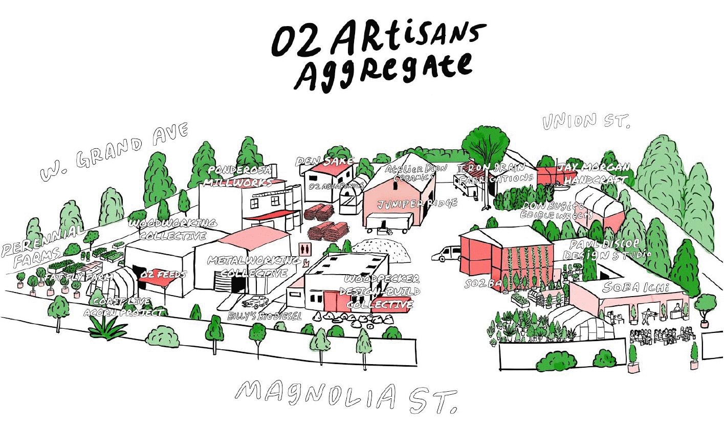 The lots include Ponderosa Millworks, an arborist and sawmill which has been working in the East Bay for over 40 years. They utilize urban trees that have been removed, and that the lumber industry usually regards as waste, to create beautiful mill slabs and furniture, working hard to make sure wood waste in the Bay Area is up-cycled and stays local. There is Soba Ichi, a restaurant serving authentic handmade soba noodles headed by chef Koichi Ishii. Everflux Technologies, who turn liquid food waste into fermented plant juice for plant fertilizer, assisting farmers and home gardeners alike in moving away from pesticides and other chemical fertilizers. Next door at Den Sake Brewery, founded by Yoshihiro Sako, they brew their sake in small batches with traditional brewing methods and use single-origin rice grown in the Sacramento Valley. Also on the lot, our fellow wild harvesters Salt Point Seaweed responsibly forage and farm seaweed along the California coast and create sustainable, high-quality seaweed snacks. Those are just a few of the incredible businesses and makers we call neighbors and friends at O2AA.