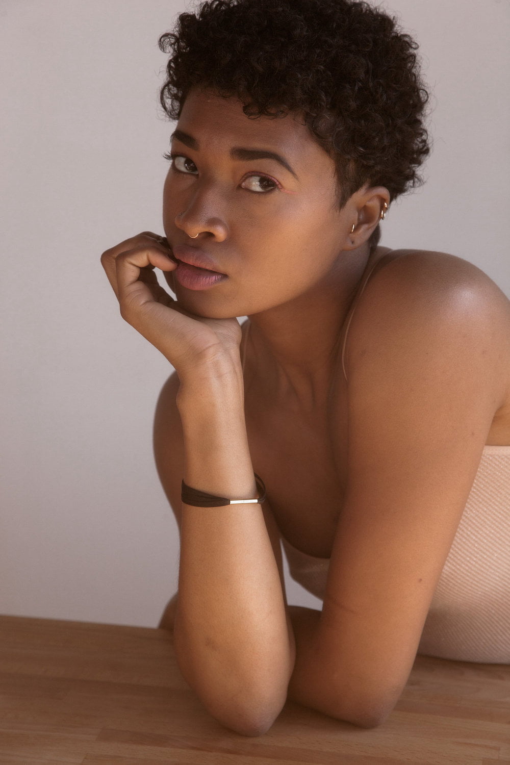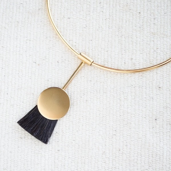 Right: From Anna Monet Jewelry, the Firebird is a minimal necklace featuring a suspended sculptural metal medallion worn with a chain or cuff option. The medallion is embellished with a small horsehair fan in the center. Created with horsehair that is ethically gathered by Native American artisans. Available in a range of natural colors and a 30-inch 18K gold plated snake chain or the neck cuff pictured.