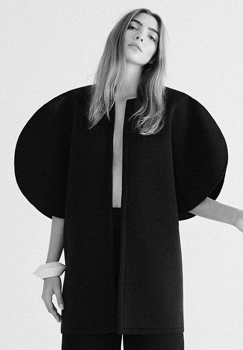 Left: The Circle Coat from conceptual womenswear designer Camelia Skikos has open sleeves and is made of cotton bonded neo fabric.