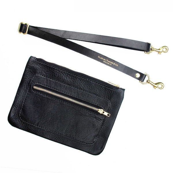 Left: The Fanny Pack in Black Pebbled Leather from Claflin, Thayer & Co. is a convertible bag can be worn so many ways – around waist, hips, over shoulder, as a clutch, or cross-body. Made of 5/6oz. pebble grain cow hide with a 6/7oz. California latigo strap and solid brass hardware.