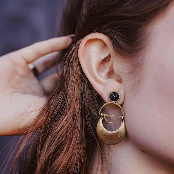 Left: Abstract Outline Earrings from Clouds & Ladders. The handmade brass frame is filled with artists’ grade polymer clay in a choice of 20 striking colors. With surgical steel posts, each earring is nickel-free and has a drop of resin on the back to prevent metal touching the ears of people with sensitive skin.