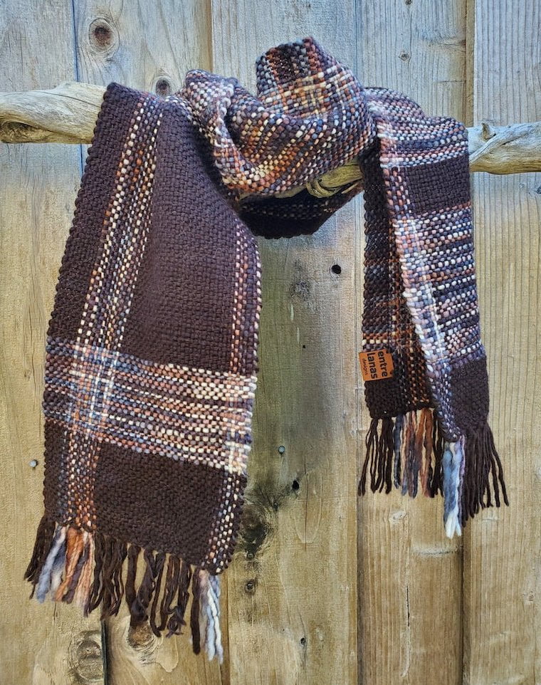 Left: The Handwoven Brown with White and Purple Scarf from Entrelanas Designs has a wonderful mix of browns, some purple, and white that give this scarf a unique touch. It’s simple and elegant, casual, and classy, for anyone with style. Handwoven from 100% pure wool.