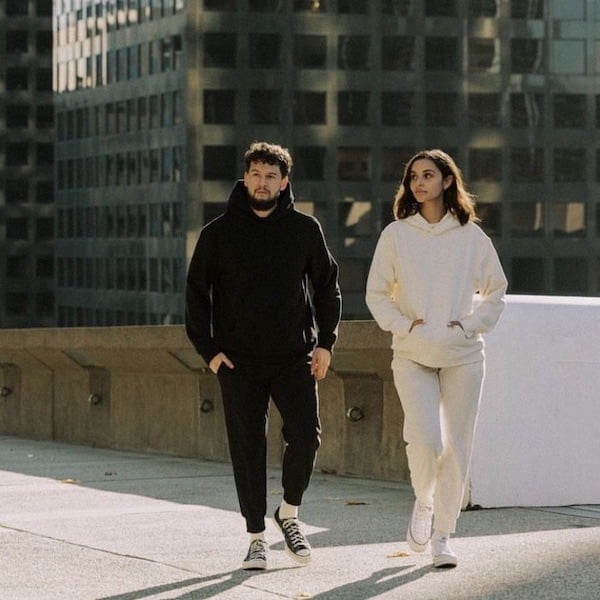 Left: Made from incredibly soft USA grown 100% organic cotton and ready for winter, Pullover Hoodie Sweatshirts and Jogger Pants from Harvest & Mill are Carbon Neutral Products available in natural and non-toxic black dyed cotton in men’s and women’s sizing.