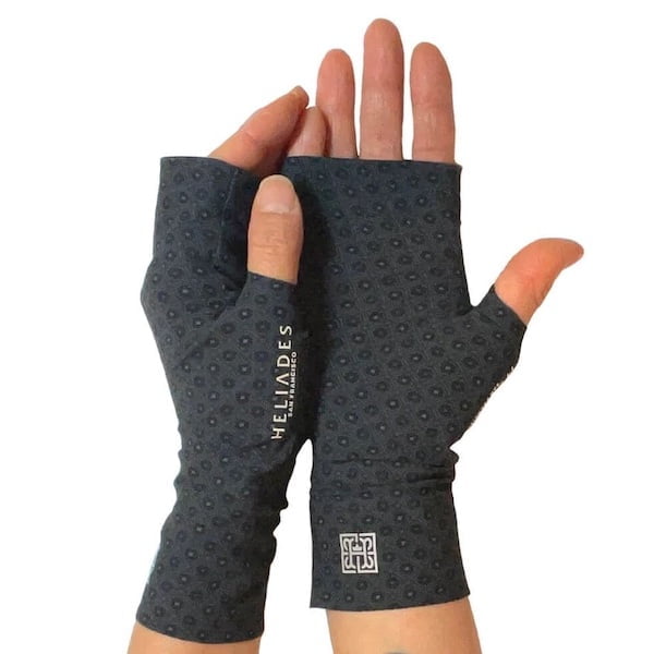 Right: UV Sun Protection Gloves in Charcoal Gray Black Rosette Print from Heliades. Be stylish and protect your skin. Fashion meets function as you shield your hands from UV damage in these wrist length, eco-luxe UPF 50+ gloves. Easier to put on than sunscreen, and perfect for everyday use, driving, or to run errands.