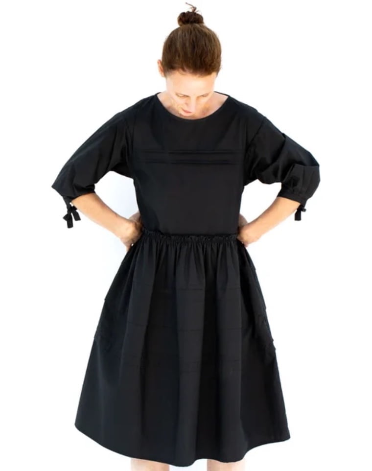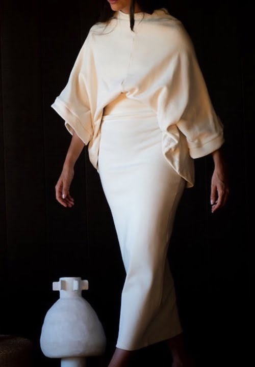 Right: The Frida Dress from Yolotli is inspired by late Mexican artist Frida Kahlo’s wardrobe. The minimalistic color juxtaposed against the layered construction and gatherings creates a garment with lots of volume, comfort, and sophistication. Made of lightweight Japanese cotton with lots of room, this dress is a dream.