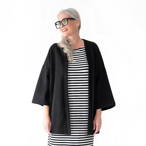 Right: The Kura Jacket from Lacson Ravello has all the coziness of your favorite cardigan and the refinement of a jacket. This easy style is perfect for days that fall somewhere between warm and cold, casual and dressy. The kimono-inspired silhouette is meant to be worn over-sized giving you plenty of room to wear layers underneath, while side-seam pockets add a practical detail. Crafted from deadstock fabric—a double-knit cotton blend with just a hint of stretch.