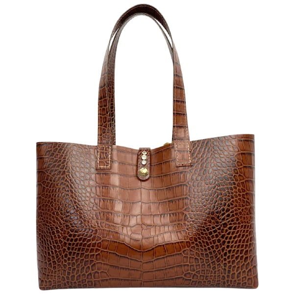 Right: The Italian Leather Ultra-Light Weight Tote 96 from MONOLISA is perfect for someone on the go. Designed with a beautiful, limited-edition ultra-lightweight brown croc embossed vegetable tanned leather. The timeless tote comes with a cotton dust bag.