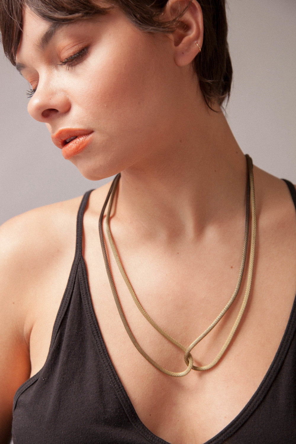 Left: The Short Coil Necklace from YMSF (a collaboration between Yvonne Mouser and Stella Fluorescent). A playful wrapping and looping 54” strand of supple brass wire mesh chain with fixed closure. Variable lengths depending on styling.